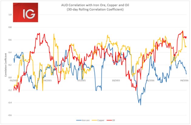 One of the most interesting aspects for Australian investors about the renewed surge in oil is what it means for the Aussie dollar. The Aussie dollar gained another 0.8% overnight as the oil price surged, and no doubt the US dollar sell off played a part in that as well. I’ve taken a little look at the which commodities the Aussie dollar is moving most closely alongside at the moment, and since the middle of March the Aussie’s daily moves have been most highly correlated with the oil price. The Aussie dollar has been far more correlated with the moves in the oil price than either moves in copper or iron ore prices. Certainly, this something to keep an eye on in the lead up to the oil producers meeting in Doha on 17 April. A large jump in the oil price in the event of some sort of deal could also see a similar move in the Aussie dollar.