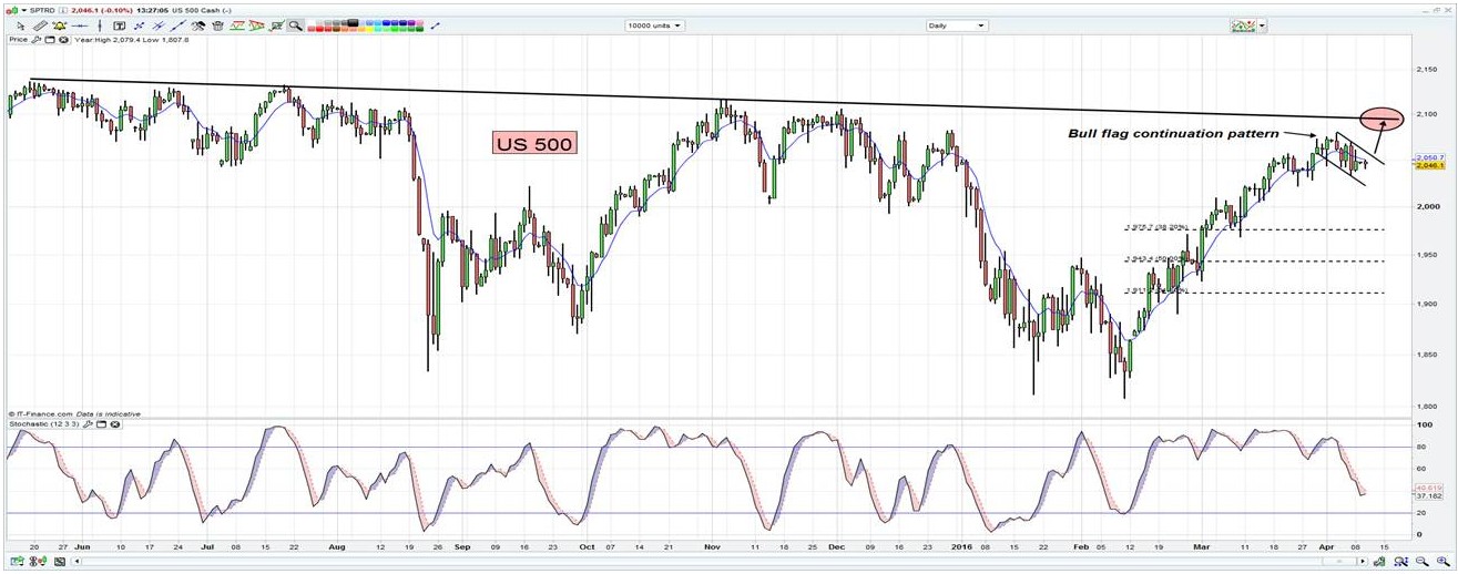 On the downside, a break of the 7 April low of 2033 would suggest a deeper move into 1975 (the 38.2% retracement of the February rally).