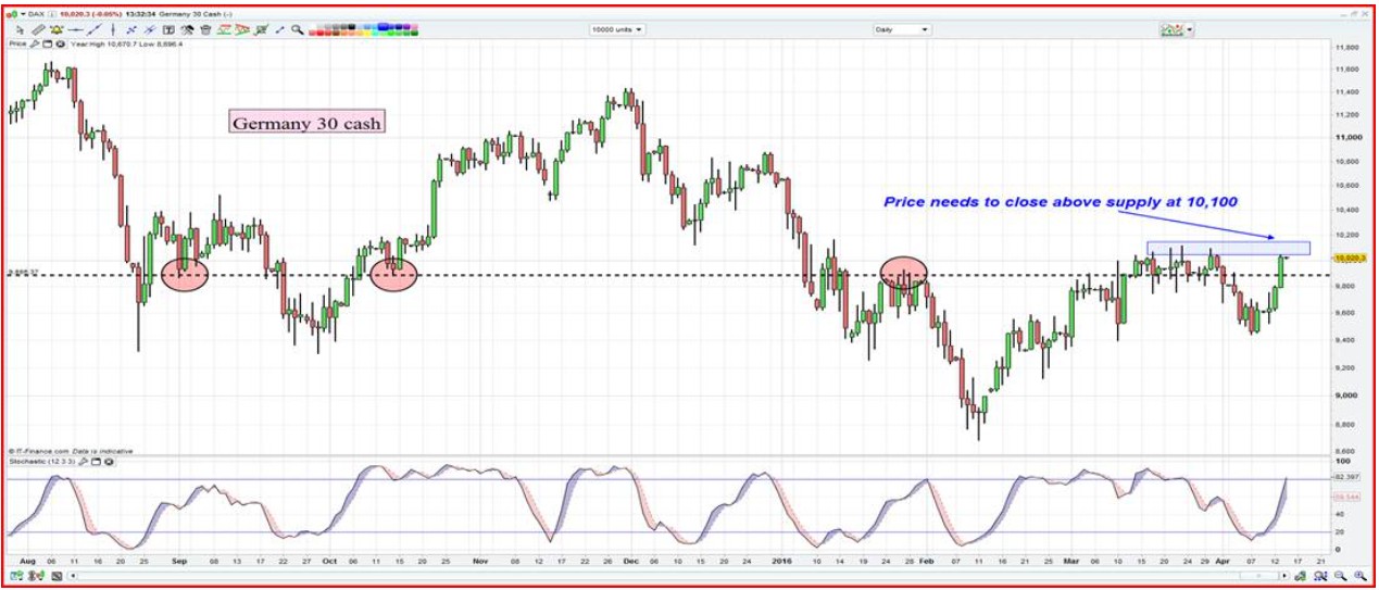 DAX – Finding buyers with help on weaker EUR, but price needs to close above supply at 10,100 (blue rectangle area). A break here would naturally be outright bullish.