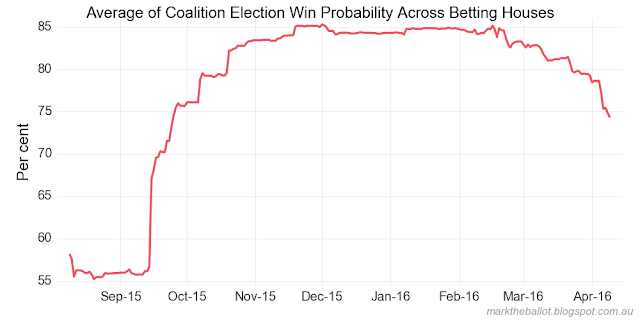 This morning sees further declines in the probability of a Coalition win at the next election according to the betting markets.