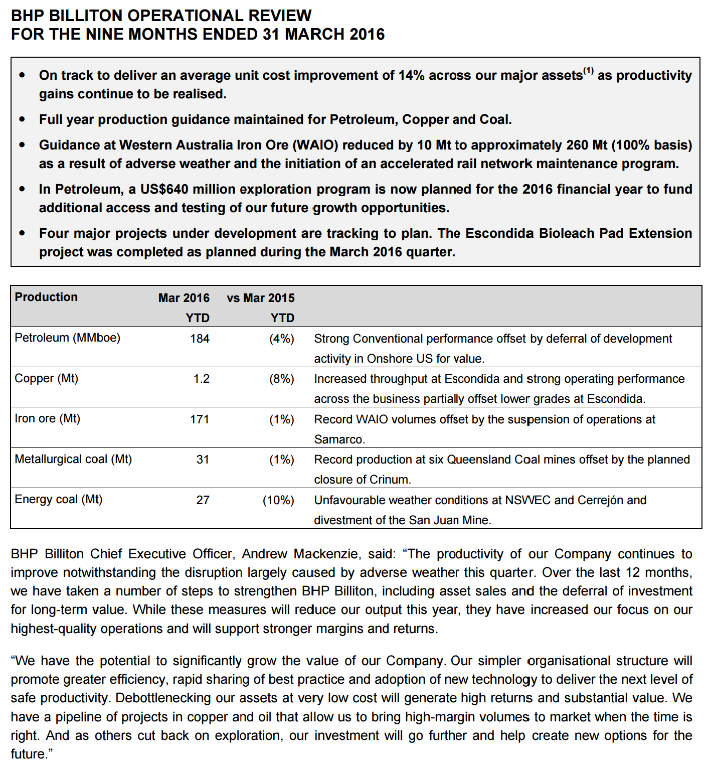 Iron ore – Total iron ore production for the nine months ended March 2016 was broadly unchanged at 171 Mt. Production for the 2016 financial year is now expected to be approximately 229 Mt, three per cent below prior guidance, and reflects a reduction in guidance at WAIO. WAIO production for the nine months ended March 2016 increased by two per cent to a record 193 Mt (100 per cent basis) and reflected the Jimblebar mining hub operating at full capacity and improved ore handling plant utilisation at Newman. This was partially offset by one-off operational issues in the December 2015 quarter, along with the impact of adverse weather conditions and the initiation of an accelerated rail network maintenance program in the March 2016 quarter. WAIO production of approximately 260 Mt is now anticipated for the 2016 financial year, four per cent below prior guidance, however unit cost guidance remains unchanged at US$15 per tonne(3). Our WAIO business remains focused on productivity in our integrated supply chain and this is further supported by the 24 month rail renewal and maintenance program that has been initiated. These improvements in our supply chain along with the ramp-up of additional capacity at the Jimblebar mining hub, will deliver an increase in system capacity to 290 Mtpa over time. Samarco production for the nine months ended March 2016 was 11 Mt (100 per cent basis). Mining and processing operations at Samarco remain suspended following the failure of the Fundão tailings dam and Santarém water dam on 5 November 2015. Sales from the final shipment of pellets from stockpiles will be settled in the June 2016 quarter