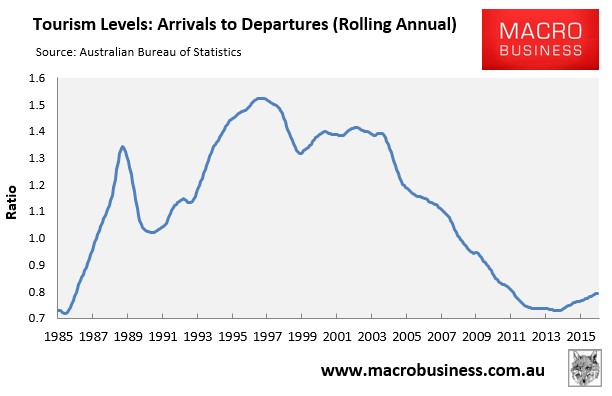 The number of short-term visitor arrivals rose 0.1% in February in trend terms, whereas short-term resident departures rose by 0.1% over the month. The ratio of annual arrivals to departures also rose to 79.4%, which was the highest level since April 2011 (see next chart).