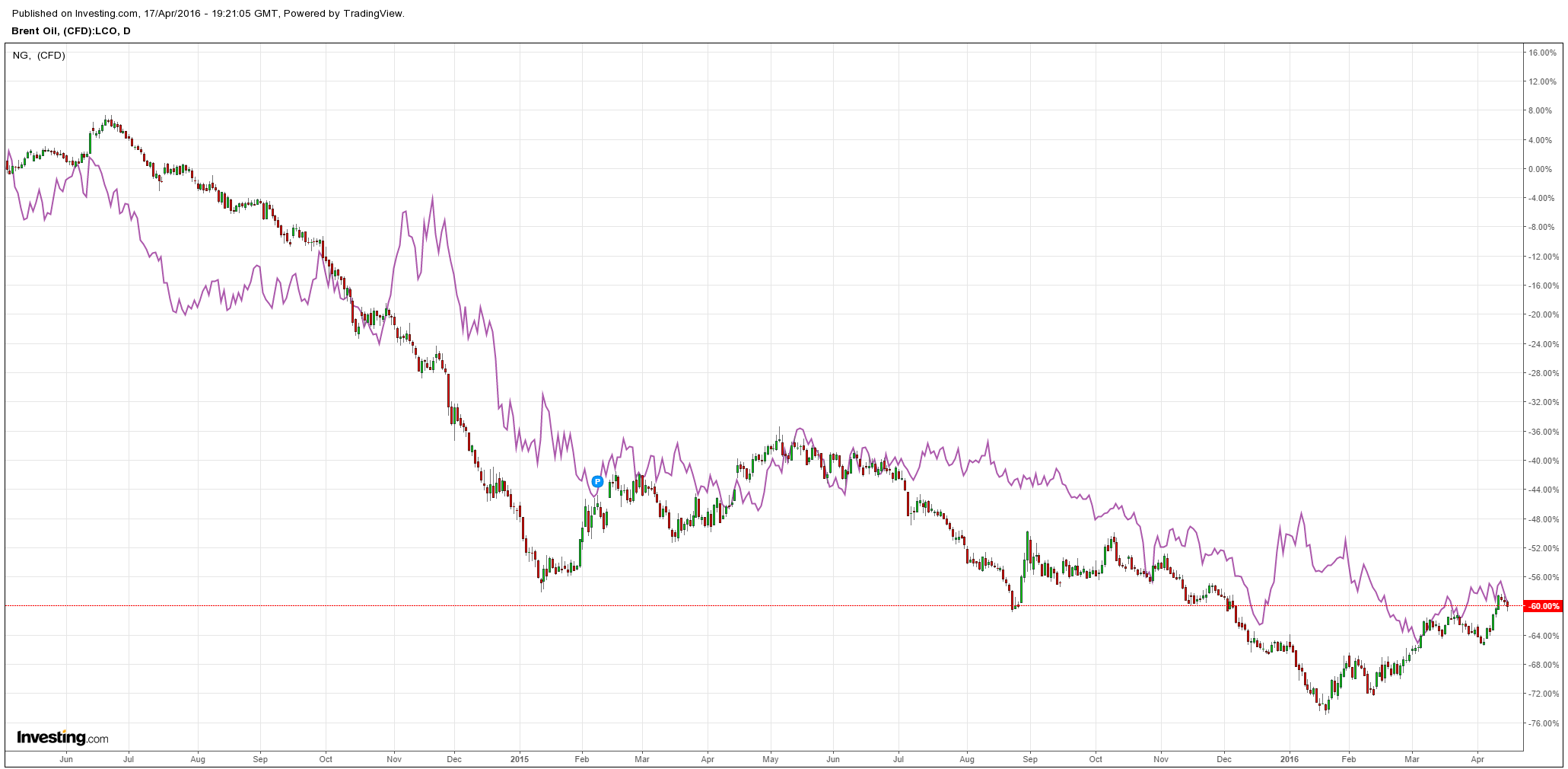 The Brent oil price fell solidly Friday night down -1.6% to $43.11. Henry Hub was also hit hard finishing at $1.90mmBtu:
