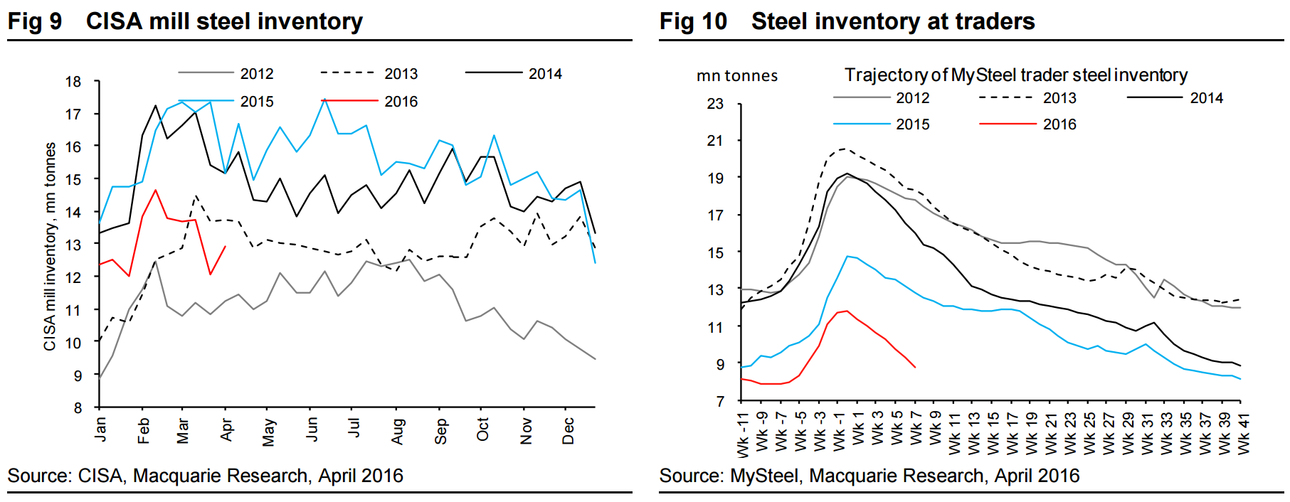 Besides the sequential improvement in end-user demand, mills’ difficulties in resuming/increasing production has also been a reason for the price rally. The main problem seems to be continued financing difficulties at small steel mills after the severe losses they undertook in 2H15. That some blast furnaces have been idled for months has also made it technically harder to restart them. Finally, as a result of the horticultural exhibition held right now in Tangshan (the largest steel producing city in China with a capacity over 100mtpa), the local government there has also forced mills to idle some sinter and coke production lines, which will effectively cap production and tighten the northern Chinese market. Even on Tuesday, the local government in Hebei messaged that currently idle facilities would not be allowed to restart (which does feel like closing the door after the horse has bolted).