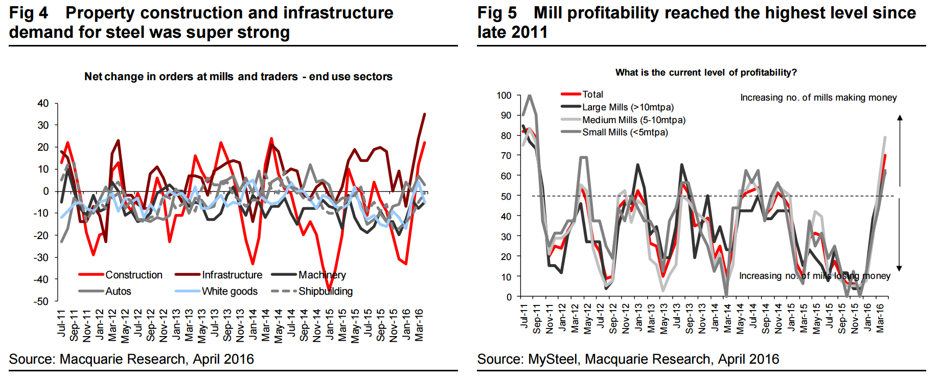 Our steel survey result for April shows a continued strengthening in demand from infrastructure and construction, with order indices for both of them reaching the highest level in the history of our survey. Sentiment among steel mills rose sharply and is now at its highest level since early 2013, while iron ore traders took a dip, perhaps reflecting the pressure from rapid supply increases from both domestic and overseas mines. With profitability also rising to the highest level in history, capacity utilisation has further recovered but still below the level seen in 1H14.
