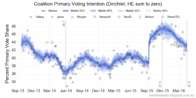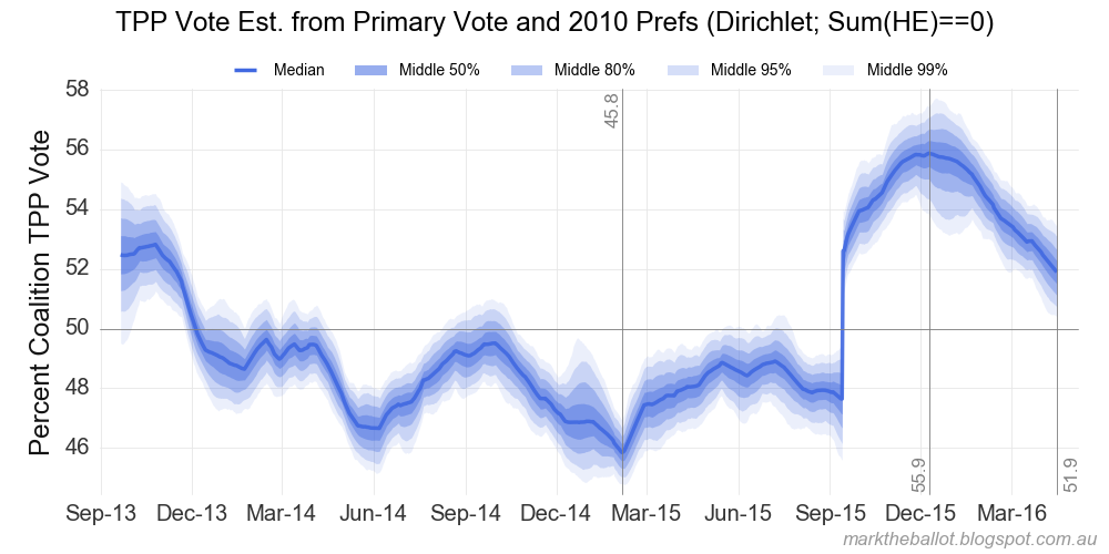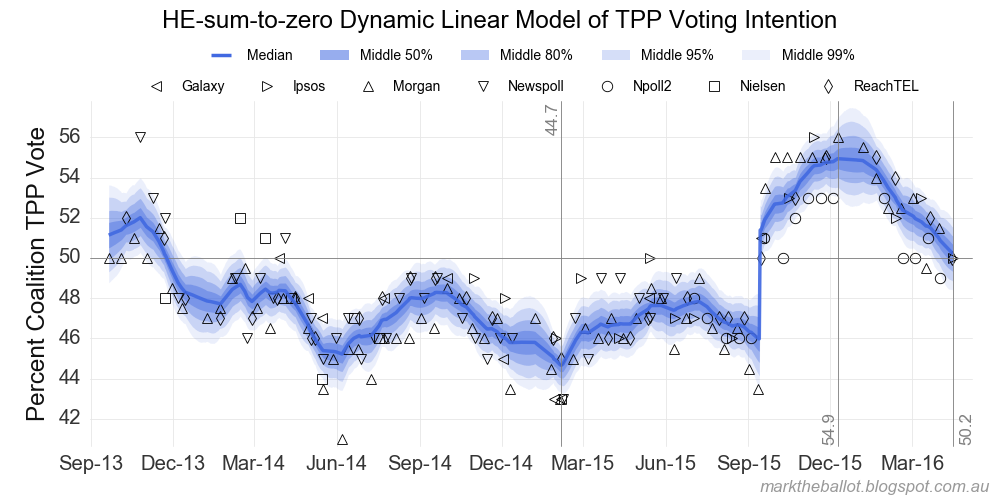 So, it is time to update the aggregation. Today’s Ipsos poll shifts the estimated national two-party-preferred vote share for the Coalition to 50.2 per cent.