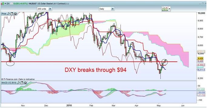 Commodities are also likely to suffer in a rising US dollar environment. The DXY Dollar Index closed above key technical resistance at $94 yesterday. Despite the disappointing Non-Farm Payrolls data on Friday, Fed speakers have taken a noticeably more hawkish turn of late, which has helped support the USD. While a rate hike in June is exceedingly unlikely, there is a valid case for the Fed to try and lay the groundwork for a potential hike in September which may be driving their hawkish turn.