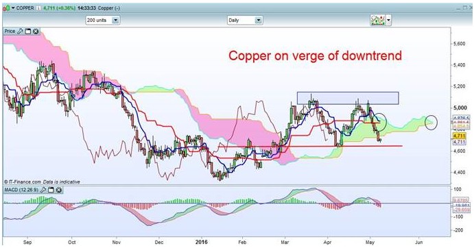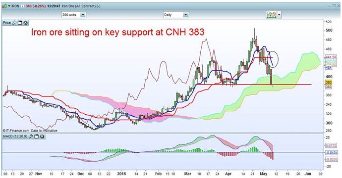 Iron ore has similarly collapsed, losing 20.5% since 22 April, which qualifies as a technical bear market, coming a mere month after it entered a technical bull market. The Tenkan-sen (blue line) has crossed below the Kijun-sen (red line), a strong reversal signal. The price has moved down dramatically and is resting on a key support level at CNH 383. A close below here is likely to see the iron ore price push down further to CNH 365 and CNH 350, the next levels of technical support.