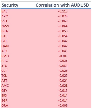 Top 20 ASX stocks with the highest correlation to Aussie dollar declines over the past year (i.e. inverse correlation to AUD/USD):