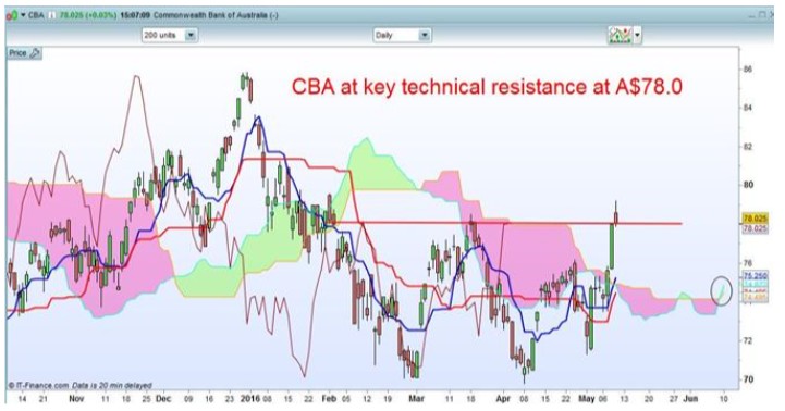 CBA was showing up in our momentum scans this morning, but has reversed in the latter half of today’s session. CBA is sitting at a key point of technical resistance at A$78.0, and a close above this level would be a key sign of a technical breakout and will be a key level to watch this week.