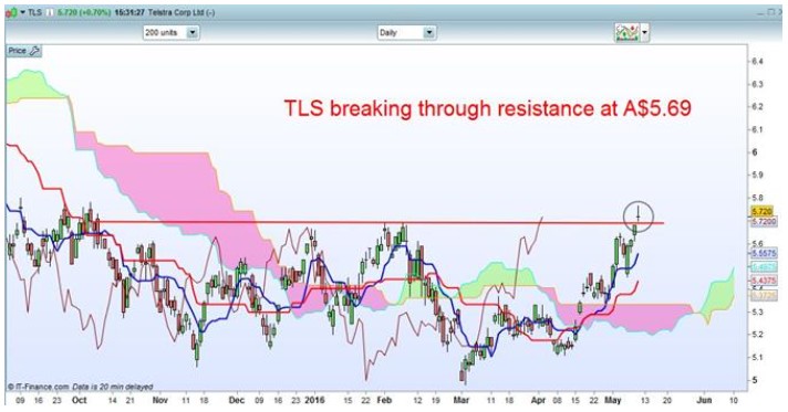 Telstra has had an impressive May so far, gaining 6.9%. Its technicals are lining up incredibly well as it looks set to close above a key level of resistance at A$5.69. The Ichimoku Cloud has turned green, indicating it’s in an uptrend. And the price is above the 9-period average Tenkan-sen (blue line), which is above the 26-period average Kijun-sen (red line). All very bullish.