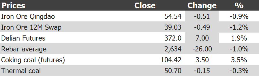 Tianjin benchmark was hit hard -1.7% to $53.50. Paper slumped though Dalian recovered 2% overnight. Rebar average keeps falling and appears to have further to retrace. Port stocks gave back 950k tonnes on last week’s big rise which may support the market a little. Steel mill profitability is still very high.