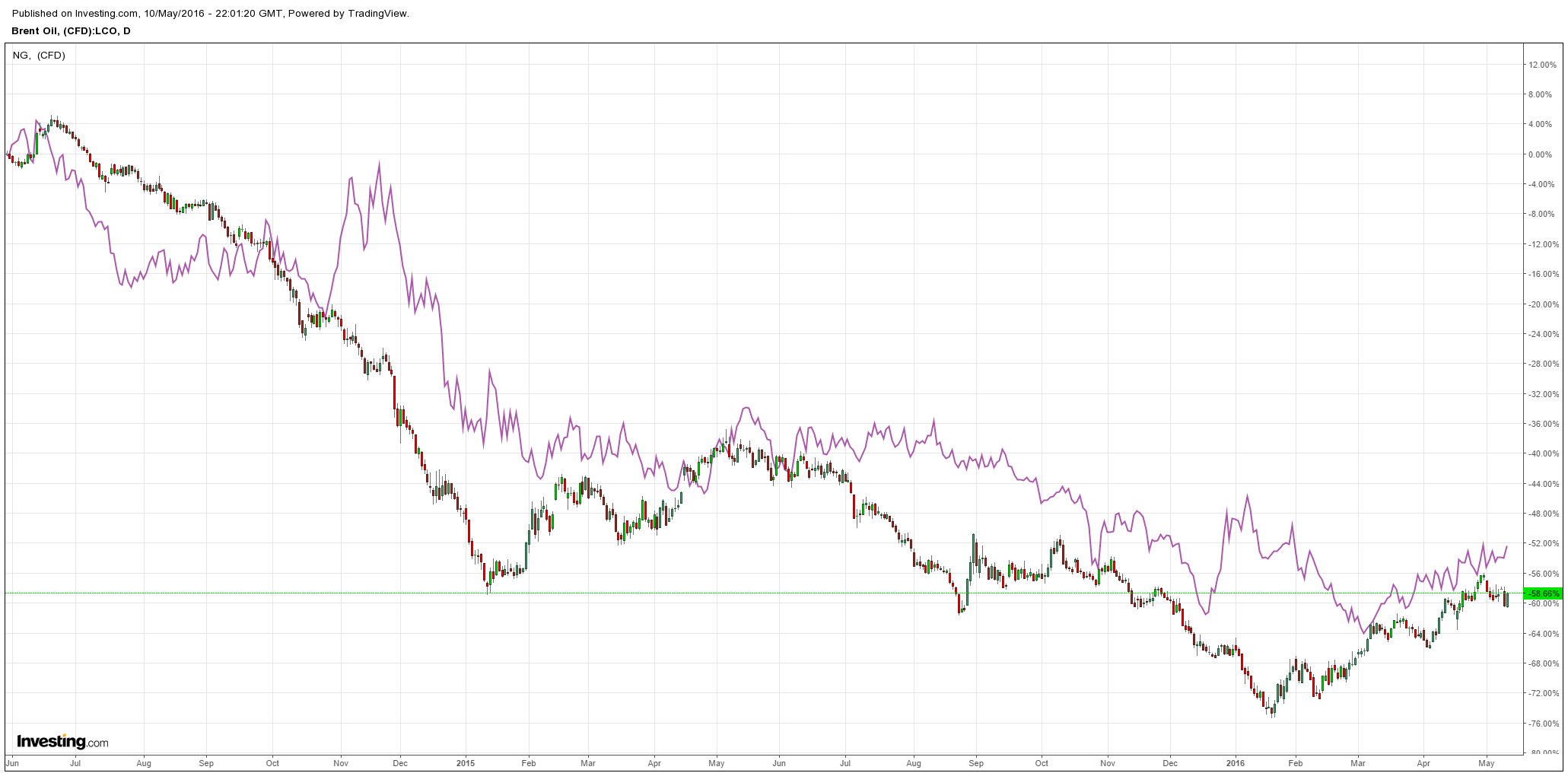The Brent oil price bounced hard last night as the EIA upped its demand forecasts for the next two years. Brent jumped to $45.46 while Henry Hub gas rose solidly to $2.16mmBtu: