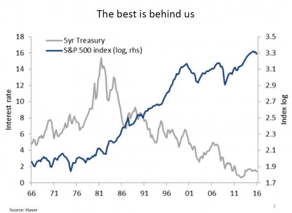 When I started Duquesne in February of 1981, the risk free rate of return, 5 year treasuries, was 15%. Real rates were close to 5%. We were setting up for one of the greatest bull markets in financial history as assets were priced incredibly cheaply to compete with risk free rates and Volcker’s brutal monetary squeeze forced much needed restructuring at the macro and micro level. It is not a coincidence that strange bedfellows Tip O’Neill and Ronald Reagan produced the last major reforms in social security and taxes shortly thereafter. Moreover, the 15% hurdle rate forced corporations to invest their capital wisely and engage in their own structural reform. If this led to one of the greatest investment environments ever, how can the mirror of it, which is where we are today, also be a great investment environment? Not a week goes by without someone extolling the virtues of the equity market because “there is no alternative” with rates at zero. The view has become so widely held it has its own acronym, “TINA”.