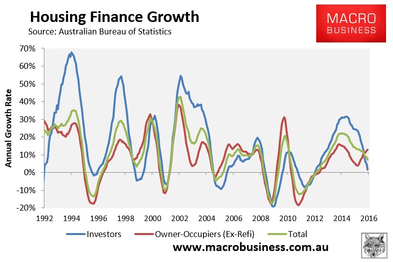 Finally, the below chart shows that the trend pick-up in the value of owner-occupied housing demand is only partly offsetting the sharp fall in investor demand: