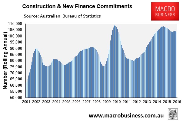 Today’s housing finance data for March posted yet another drop in new home finance commitments, with the number of commitments for both construction and new dwellings falling by 3.0% over the month to be down by 5.9% over the year (see below charts).
