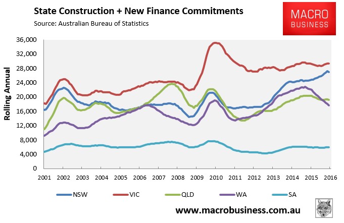 Looking at at the state-by-state breakdown, which is presented below on a rolling annual basis since it is not seasonally adjusted, shows that new home finance commitments remain solid in both New South Wales Victoria, whereas they have softened in Queensland and have fallen sharply in Western Australia. South Australia is stable. (see next chart).