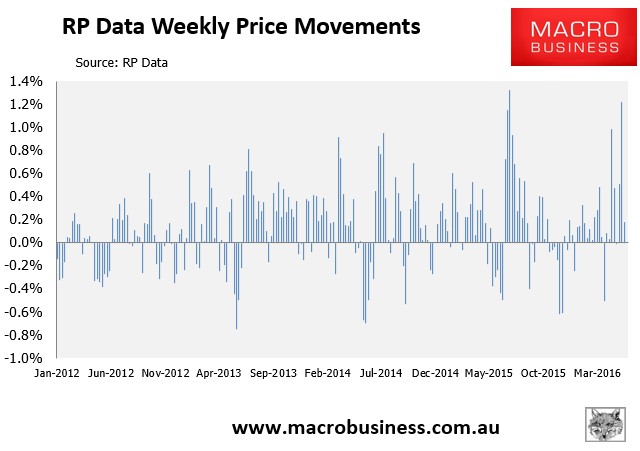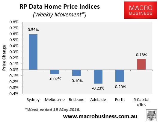 In the week ended 19 May 2016, the Core Logic-RP Data 5-city daily dwelling price index, which covers the five major capital city markets rose by another 0.18%: