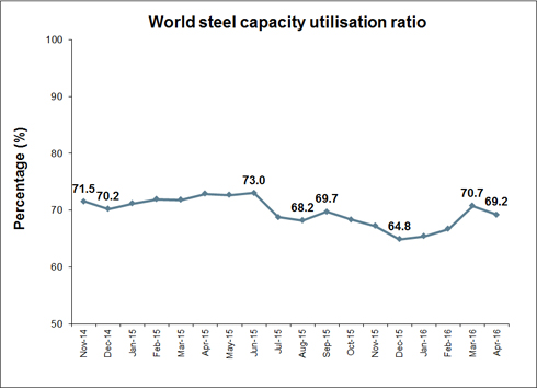 The crude steel capacity utilisation ratio of the 66 countries in April 2016 was 69.2%. This is -3.6 percentage points lower than April 2015. Compared to March 2016, it is 1.5 percentage points lower.