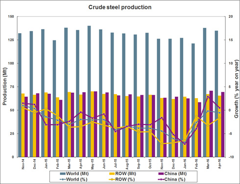 World crude steel production for the 66 countries reporting to the World Steel Association (worldsteel) was 135 million tonnes (Mt) in April 2016, a -0.5% decrease compared to April 2015.