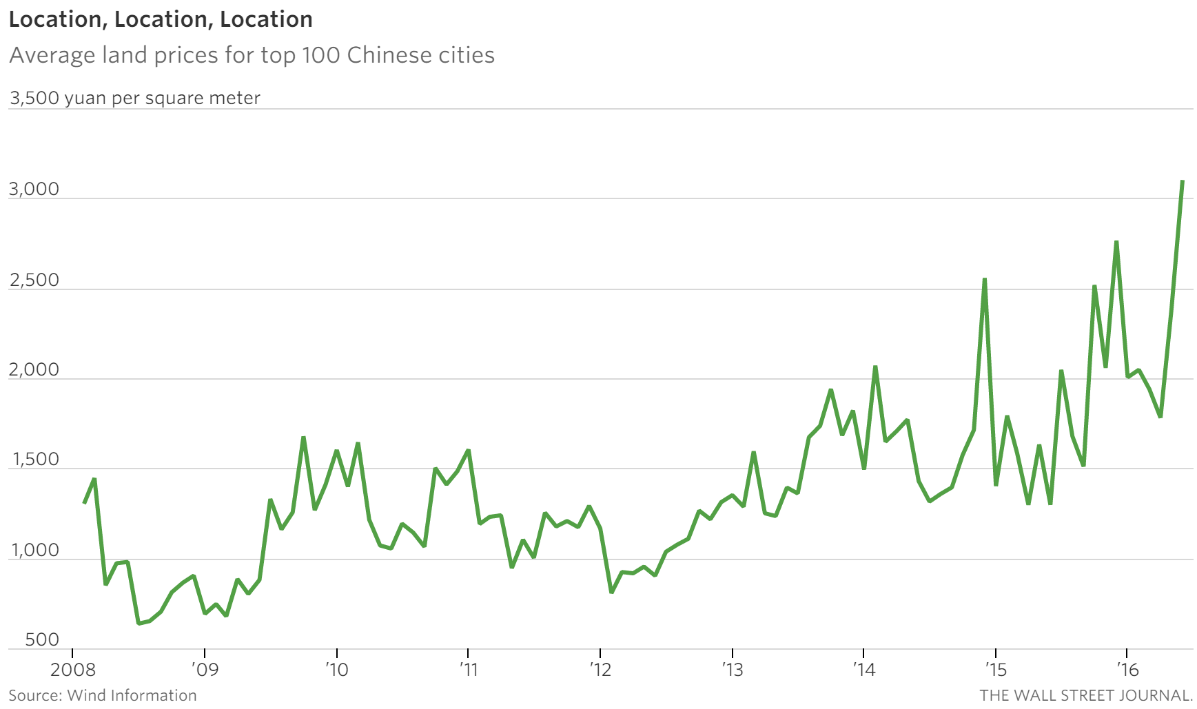 Prices for land, the main ingredient of the property world, have hit record highs in auctions this year in many Chinese cities. The average land price per square meter for the top 100 cities in the first five months of this year jumped nearly 50% from the same period last year, according to Wind Information. Some land prices are even higher than housing prices nearby.