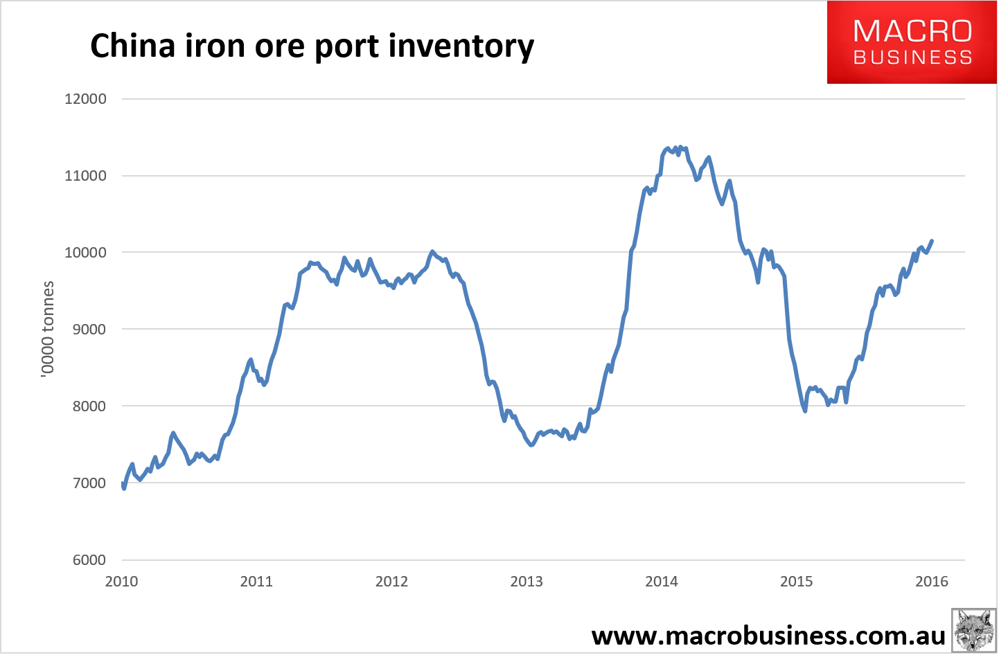 Tianjin spot fell 0.6% to $51.40. Dalian was up overnight after resisting Brexit Friday. This can happen with iron ore given its monumental China exposure especially while steel prices remain stable. Port stocks rose another 800k tonnes last week and are mounting to quite a pile. So long as we stay above $50 these port stocks will keep building. And when the inventory cycle turns we’ll give it all back plus interest.