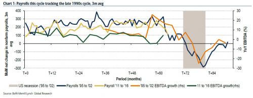 It also may suggest that with margins high and borrowing costs low, the inevitable fall to negative payrolls may take a bit longer. In fact, we think there is a distinct possibility that we could live through a period of time when companies could even fire more than they hire without being in a recession, as consumer balance sheets are relatively healthy. In fact, without a banking crisis and housing crisis, we think the driving force behind the next leg in the economic slowdown is likely to be driven by households pulling back on spending as job security becomes an issue.Only unlike housing, which unraveled quickly, the consumer boom/bust cycle is likely to be slower and longer as the negative feedback loop of lower employment to reduced spending, reduced corporate profits, and more layoffs and liquidations may look less Fisherian than “glacierian”.