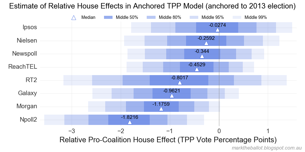 With the magic of poll aggregation, we can see that the trend continues to move away from the Coalition. The next chart is of the aggregation of the two-party preferred (TPP) vote share that is anchored to the 2013 election result.
