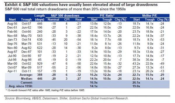 Elevated equity valuations tend to increase the risk of drawdowns for the simple reason that there is less of a valuation cushion to absorb unanticipated negative events. And while high equity valuations alone are not a reason for drawdown, particularly if they reflect stable macro conditions and if volatility is low and remains anchored, we believe that high valuations make equities more vulnerable. Exhibit 4 shows that ahead of the largest S&P 500 drawdowns, equity valuations have usually been elevated and sharply contracted during a correction – there is a somewhat positive relationship between valuations and the size of drawdowns.