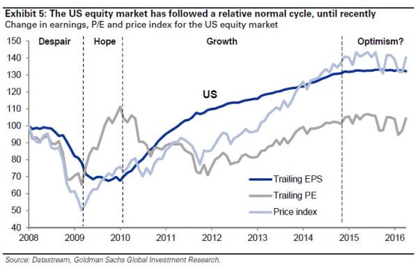 The US has followed a relatively ‘typical’ equity cycle post the GFC. After a sharp correction driven by a decline in both earnings and P/E ratios in 2008 (‘Despair’), from March 2009 US equities recovered sharply, mainly driven by P/E ratios, in anticipation of earnings growth (‘Hope’). In 2010 it entered the ‘Growth’-phase, which tends to last longer and where equities increase mainly driven by earnings growth. But in this cycle S&P 500 P/E ratios expanded already during the ‘Growth’-phase from mid-July 2012, as a function of easy monetary policy globally and strong share buybacks. And since 4Q14 valuations have been the key driver of returns due to little earnings growth – as a result the US likely entered the ‘Optimism’ phase. It might be too early to say we already moved out of the ‘Growth’-phase since earnings growth has slowed in large part due to sharp declines in commodity prices since mid-2014, however, with margins at peak levels prospects for a material acceleration of earnings growth appear limited from here.
