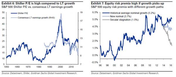 However, if secular stagnation is increasingly priced by the market, equities might suffer as growth expectations built into valuations would have to fall – if the market reduces its long-term growth expectations the equity risk premium could be much lower, closer to levels from 2007 . Similarly, if bond yields normalise faster than market expectations, this should also weigh on valuations. Changes in the growth/rates mix (how much do rates increase relative to growth?) will be key for equity performance from here. As a result equities appear vulnerable to both ‘growth shocks’ (e.g. secular stagnation repricing, US recession or another China slowdown/RMB devaluation) and ‘rate shocks’ (e.g. Fed rate hike cycle too steep or other central bank disappointments). In addition there could be financial market and geopolitical shocks that further tighten financial conditions, e.g. Brexit, US presidential elections etc.