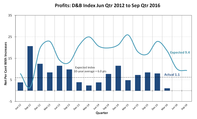 Dun & Bradstreet’s Business Expectations Index, the average of the survey’s measures of Sales, Profits, Employment and Capital Investment, has consolidated at 12.3 points for the third quarter of 2016, compared to 12.7 points for Q2 2016, and down from 17.6 points in Q3 2015. The figure is 5.0 points above the 10-year average of 7.3 points.