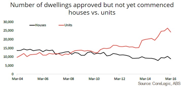 While the number of dwellings under construction is at record highs we are also seeing an elevated number of houses and units which have been approved for construction but not yet commenced. At the end of March 2016 there were 8,817 houses and 24,175 units which had been approved for construction but not yet commenced…