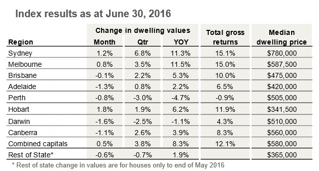 Following on from yesterday’s post on CoreLogic’s daily dwelling values index results for June, CoreLogic has released its full results, which also cover the smaller capitals and regional areas (see next table).