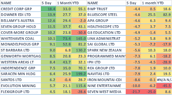 The early results from earnings season are unsurprisingly having a big influence on stocks returns. Credit Corp (CCP) and Downer EDI (DOW) both had upside earnings surprises, which helped them see the best two weekly performances. Seven West Media’s full-year results saw the opposite reaction, with the stock crashing after SWM warned of a 15-20% fall in FY2017 earnings. DOW’s better than expected earnings also helped see buying in its competitor Monadelphous Group, which continues to rally despite being the eighth most shorted stock in the index.