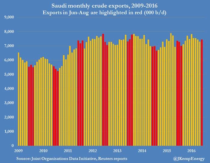 The news flow is bad for prices. Libya is clearing its latest blockages. Nigeria‘s Niger Delta Avengers have declared a ceasefire. US rigs continue to drip back into the field, up another 10 to 406. The Saudi jawboning joke is now obvious to all not least because it’s pumping with its ears pinned back, from John Kemp:
