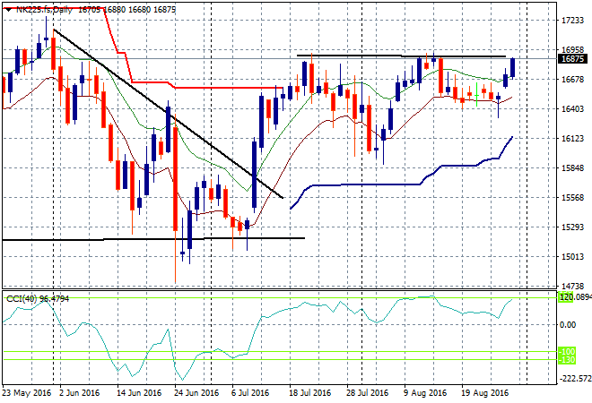 The Shanghai Composite continues to put in scratch sessions, yesterday lifting only 4 points to remain stuck at around 3070 points after last week’s breakout. I’m still watching the clearance of the previous daily high for a breakout and a drop below 3000 for a breakdown for long/short entries: