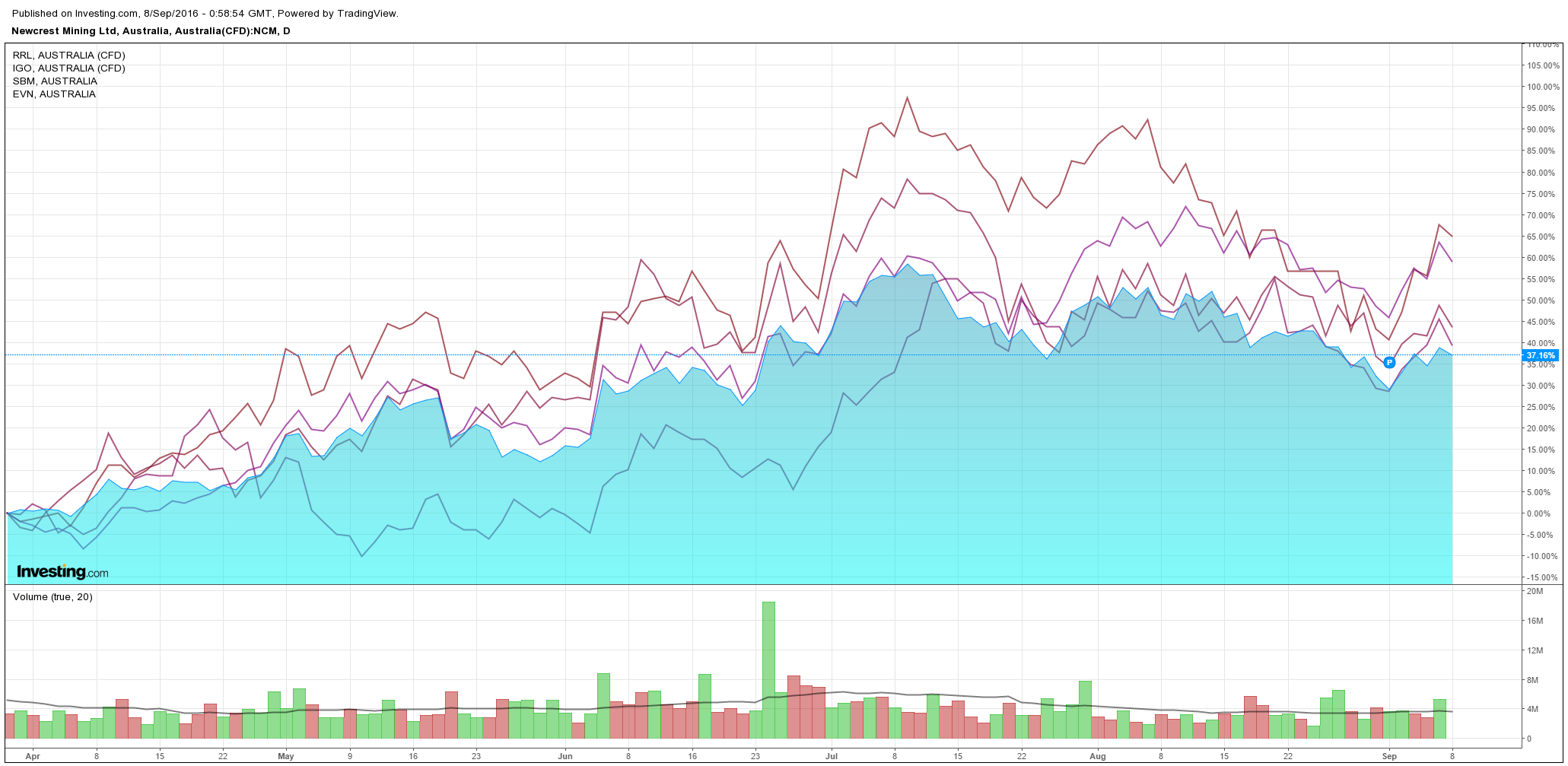 Big Gold is also off yesterday’s red hot action with RRL -2.5%, NCM -1.4%, IGO -3.6%, SBM -3.5% and EVN -1.4%: