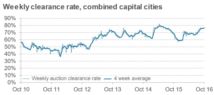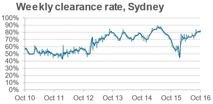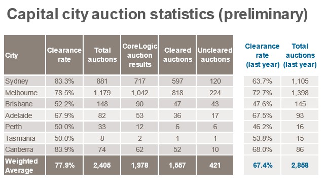 Sydney’s clearance rate was up by 19.6% against the same weekend last year, although auction volumes were down 20%: