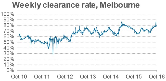 As shown in the next chart, Melbourne auction clearances were up by 5.8% versus the same weekend last year, although auction volumes were down 16%: