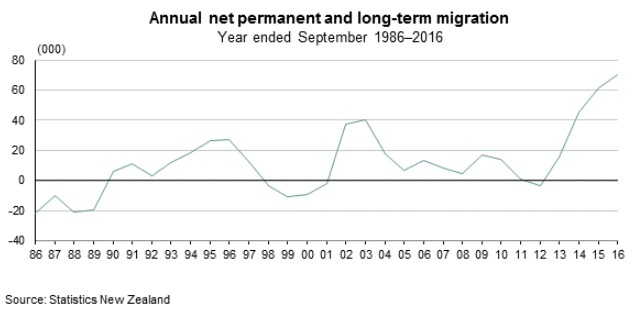 Statistics New Zealand has released its permanent & long-term migration figures for September 2016, which revealed that net permanent and long-term migration into New Zealand continues to boom, hitting a record high annual net gain of 70,000 migrants: