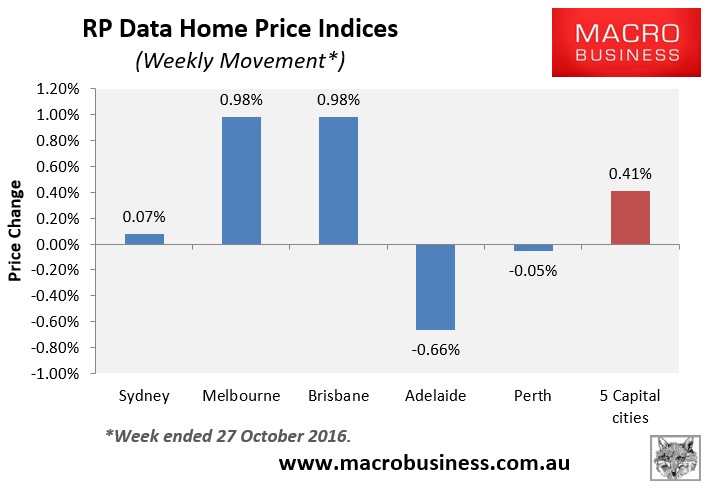 In the week ended 27 October 2016, the CoreLogic 5-city daily dwelling price index, which covers the five major capital city markets rose by 0.41%: