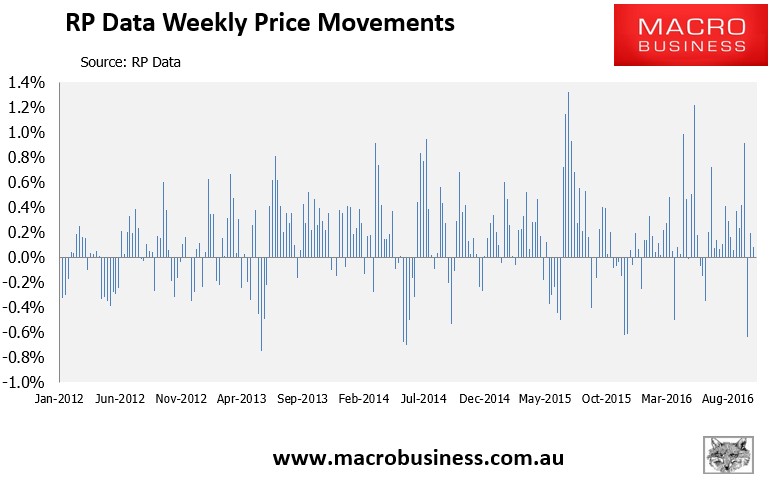 In the week ended 6 October 2016, the CoreLogic 5-city daily dwelling price index, which covers the five major capital city markets rose by 0.08%: