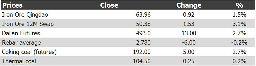 Tianjin benchmark rose 1.3% to $63.10. Paper up even more overnight. Rebar stalled. Steel mill profitability is at new lows. Coking coal was unchanged. Thermal hit a new high.