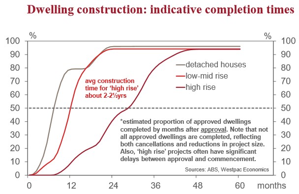 Our statistical analysis of approvals, starts and completions confirms the longer lags for high rise activity. The chart below shows indicative completion times for different dwelling types. Whereas the average detached house takes 6mths to complete and the average mid-low rise dwelling takes 10mths, the average high rise dwelling takes the best part of two years.