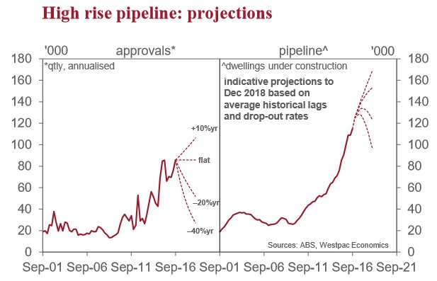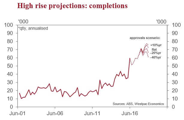 Using our profile of the distribution of completion times we can flesh the forward view out a bit more by running projections based on a range of assumptions about the flow of new approvals. Industry reports suggest there is a large number of high rise projects at the earlier ‘pre-approval’ stages of development. Hence while recent changes affecting developers and investors highlight risks to the downside there is also a plausible case for activity to remain strong near term.