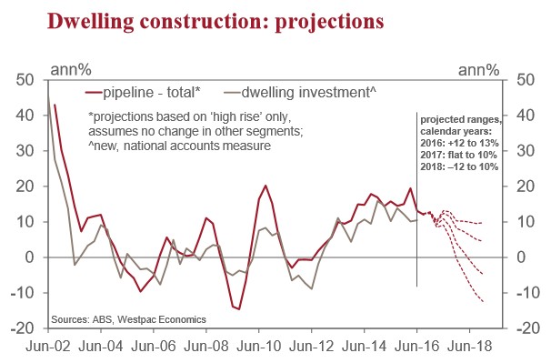 The bottom line is that the total pipeline is likely to finish 2016 up 12-13%yr with growth under ‘correction’ scenarios slowing to 0-4% in calendar 2017. Again, the assumed path for high rise approvals only starts to dominate from 2018 with the two ‘correction’ scenarios ranging from –4.7%yr to –12.4%yr.