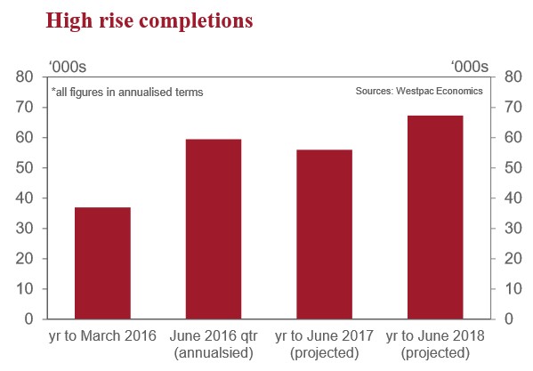 - The much longer time frame on high rise projects means further rises in the high rise pipeline and growth in residential investment are essentially locked in for 2016 and 2017. Any sharp drop off in approvals will only impact from 2018 on. Completions have entered a sustained rise and will remain elevated at around 55-65k a year through to late 2018 even if approvals correct sharply lower.