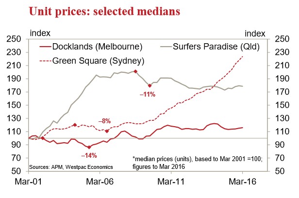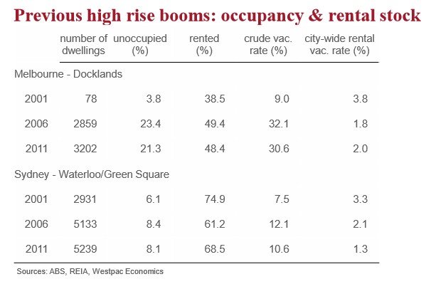 History provides some limited guidance. Previous high rise building booms have generated localised oversupply problems in both Sydney (in the inner south in 2004-06) and Melbourne (in the Docklands precinct in 2002-05). The former proved to be a relatively minor issue with supply absorbed reasonably quickly. The latter appeared to be a more severe with a longer lasting oversupply. Note that in both cases impacts on the wider rental market were limited (city-wide vacancy rates actually declined).