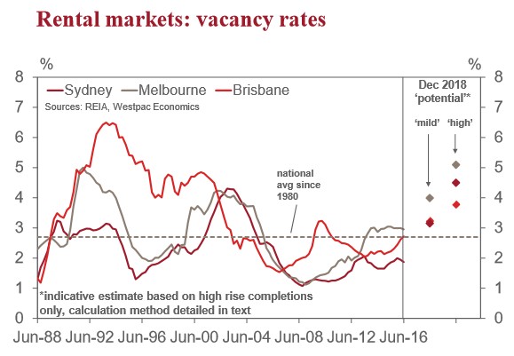 The resulting estimates suggest city wide rental vacancy rates could rise 1-1½ppts in Sydney and Melbourne under a ‘moderate’ absorption problem (the experience in Sydney’s inner south) and by 2-2½ppts under a more ‘difficult’ scenario (based on the experience in Melbourne’s Docklands).